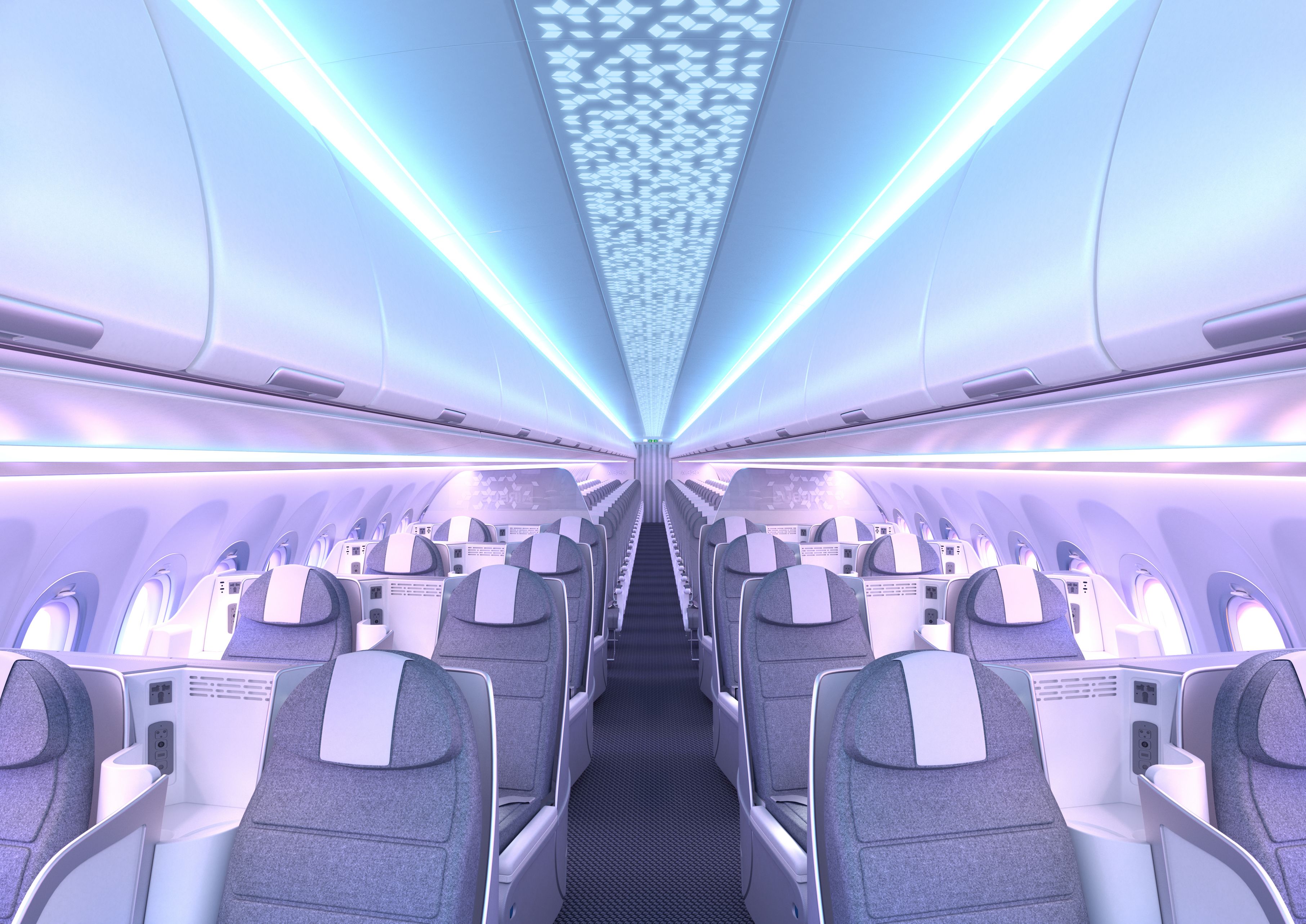 Airbus’ cabin’s high ceilings give rise to the feeling of more open space, while ergonomic sidewalls provide additional shoulder clearance – all together making perfect use of the cross-section. Even the window surrounds are framed to amplify the airiness. Personal space is maximised through perfect integration of seats on a flat floor and in-flight entertainment (IFE) seat boxes that do not intrude upon foot space.